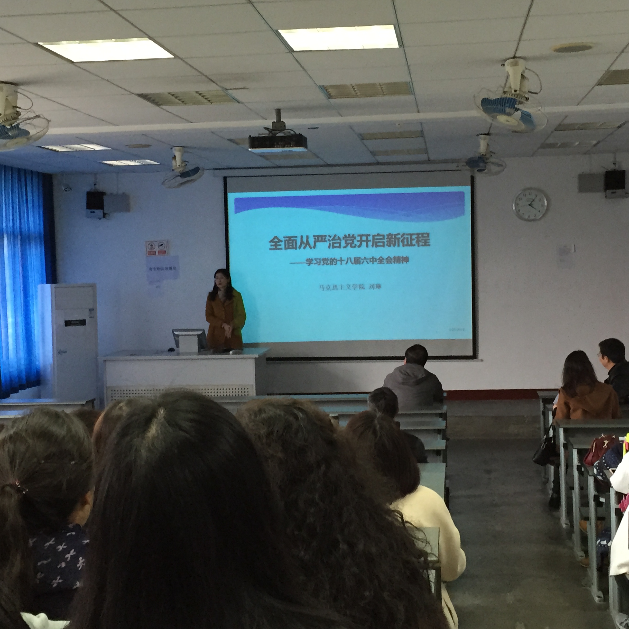 刘琳老师以“全面从严治党开启新征程”为题开展讲座。讲座从四个方面对党的十八届六中全会精神进行了解读:一、十八届六中全会基本情况和重大意义;二、《关于新形势下党内监督的若干准则》;三、《中国共产党党内监督条例》;四、坚定理想信念,做政治上的明白人。刘老师指出党的十八届六中全会是新的历史时期全面从严治党的一次标志性会议,是中国共产党有史以来对执政党自身建设最全面、最严格、最规范的顶层设计和总体部署。希望老师们认真理清全会精神脉络、掌握精神要点和内容,为进一步深入学习贯彻全会精神夯实基础。